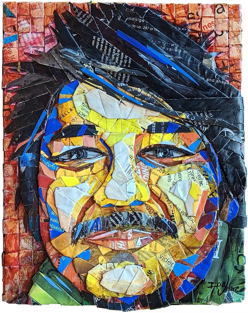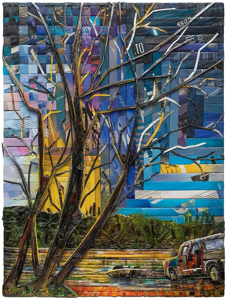 With little money to buy supplies, she chose paper, specifically the piles of paper stuffed into mailboxes daily, as her way of creating art. That satisfied Eloa Jane’s need to, in her own words, “find fulfillment in creating meanings rather than owning disposables.” Using an endless supply of trash, she can spread awareness while contributing to saving the earth’s resources with her art and lifestyle. The resulting work is instrumentalist in function, imploring the viewer to take stock of our wasteful practices, but at its core, it expresses a distinct sense of hopefulness about the future. Her work has evolved in technique and meaning since then. Her first solo exhibition was in Massachusetts in 2008. In 2014 she established her studio in Mid-America Arkansas and had a turning point in her art career with her awarded series Neighbors and Neighborhood.